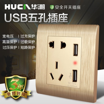 拉丝五孔USB插座,双USB口,美观香槟金,拉丝五孔插座。