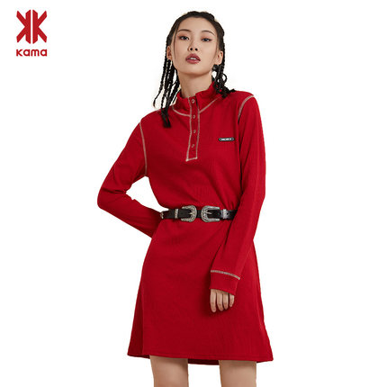 KAMA卡玛时尚潮流,中领系扣休闲,套头连体针织,连衣裙条纹,撞色个性立领,修身显瘦~赠运费险